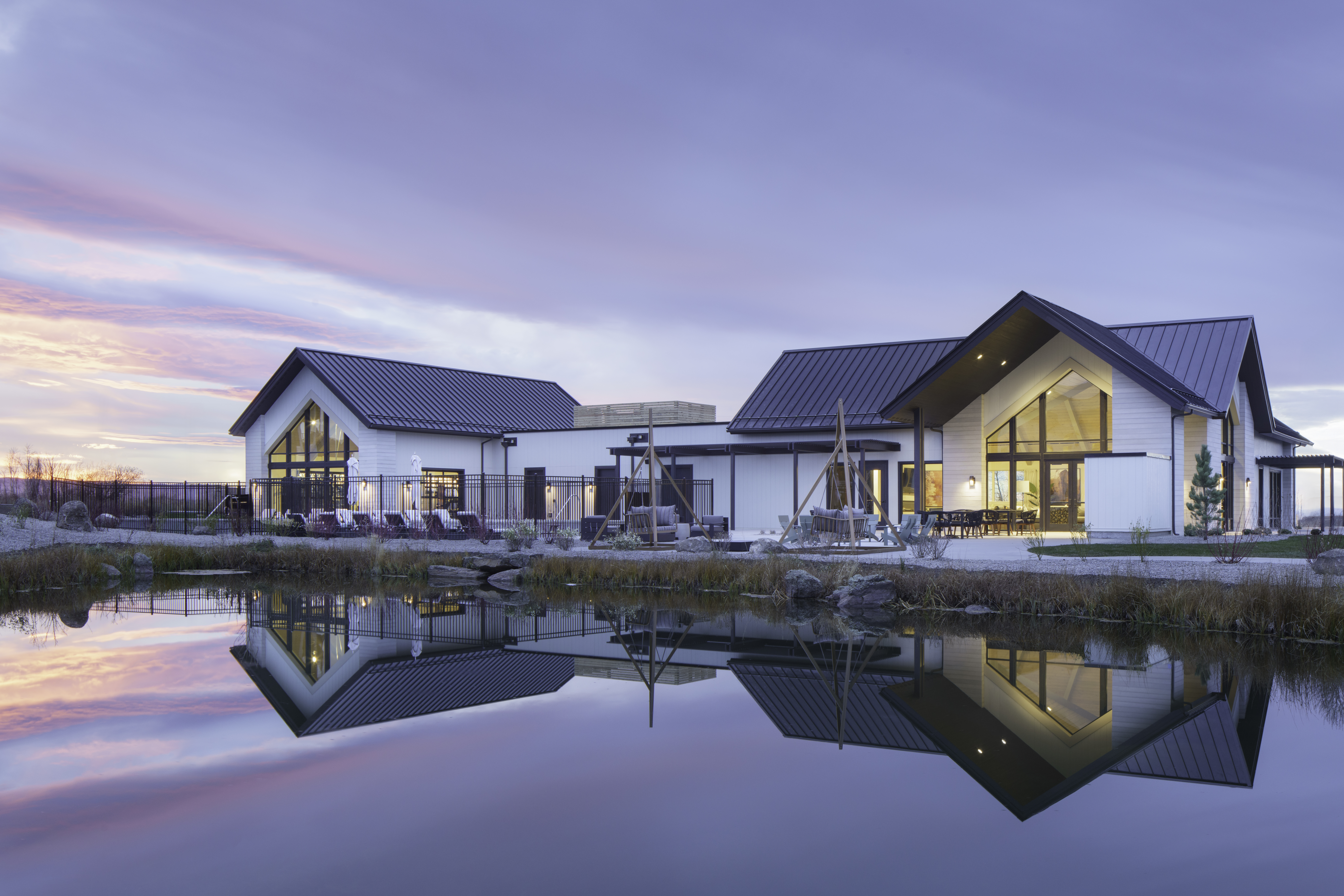 The clubhouse at Buffalo Run offers a warm, welcoming lounge with a stone fireplace and expansive views of the surrounding landscape. Vaulted wood ceilings, natural textures, and floor-to-ceiling glass shape a refined yet relaxed space for connection, quiet moments, and everything in between.